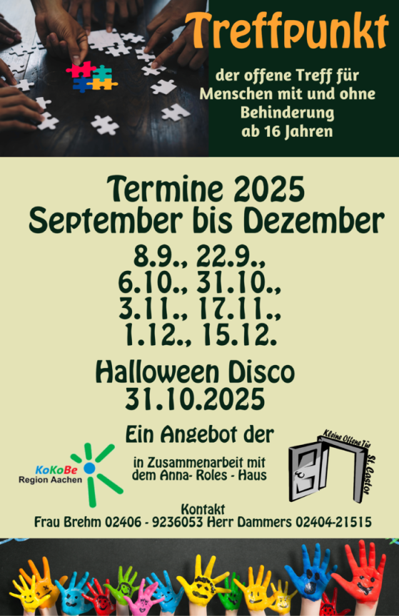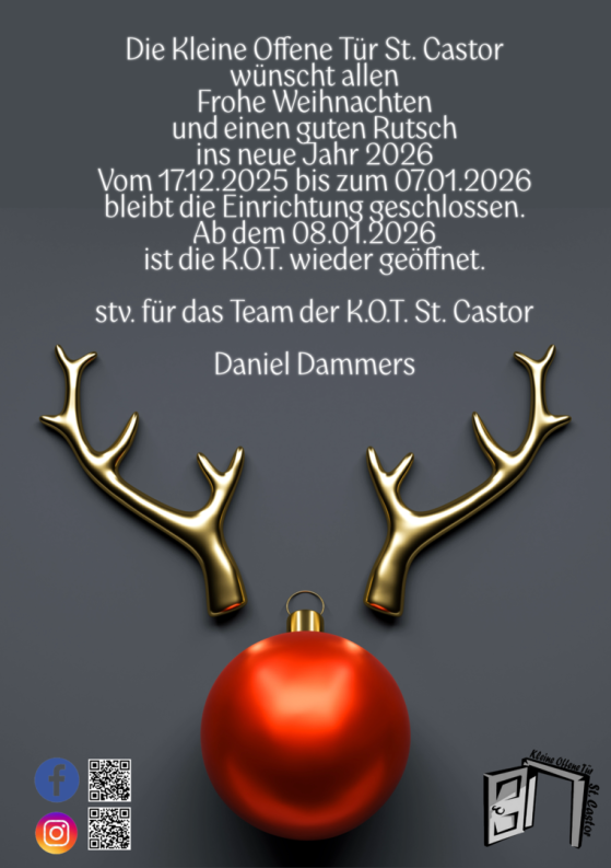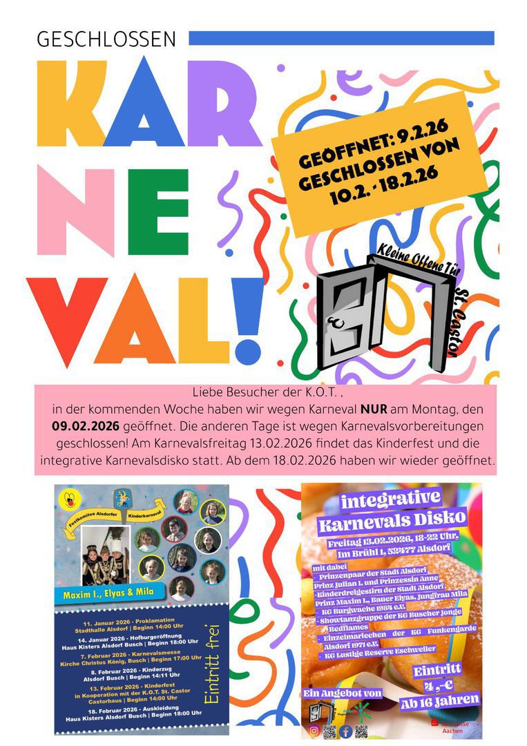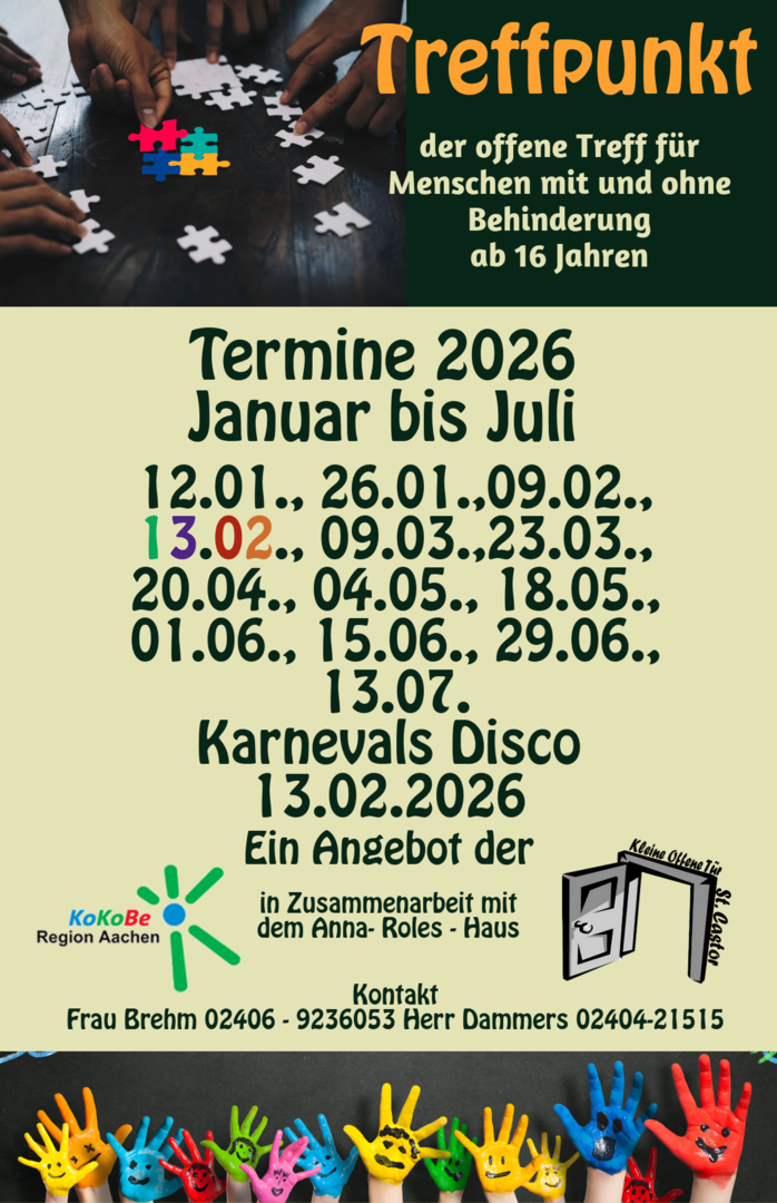 Hier sind die Termine für unseren Treffpunkt für Jugendliche und junge Erwachsene ab 16 Jahren. Der Treffpunkt findet alle zwei Wochen von 18:00 bis 21:00 Uhr in der K.O.T. St. Castor statt, zusammen mit der Kokobe. Am 28. Februar 2025 gibt es eine Karnevalsdisko. Karneval ist eine Zeit, in der viele Menschen sich verkleiden und feiern. Es gibt ein tolles Programm für Jung und Alt, mit Musik, Tanz und Spaß. Alle sind willkommen!