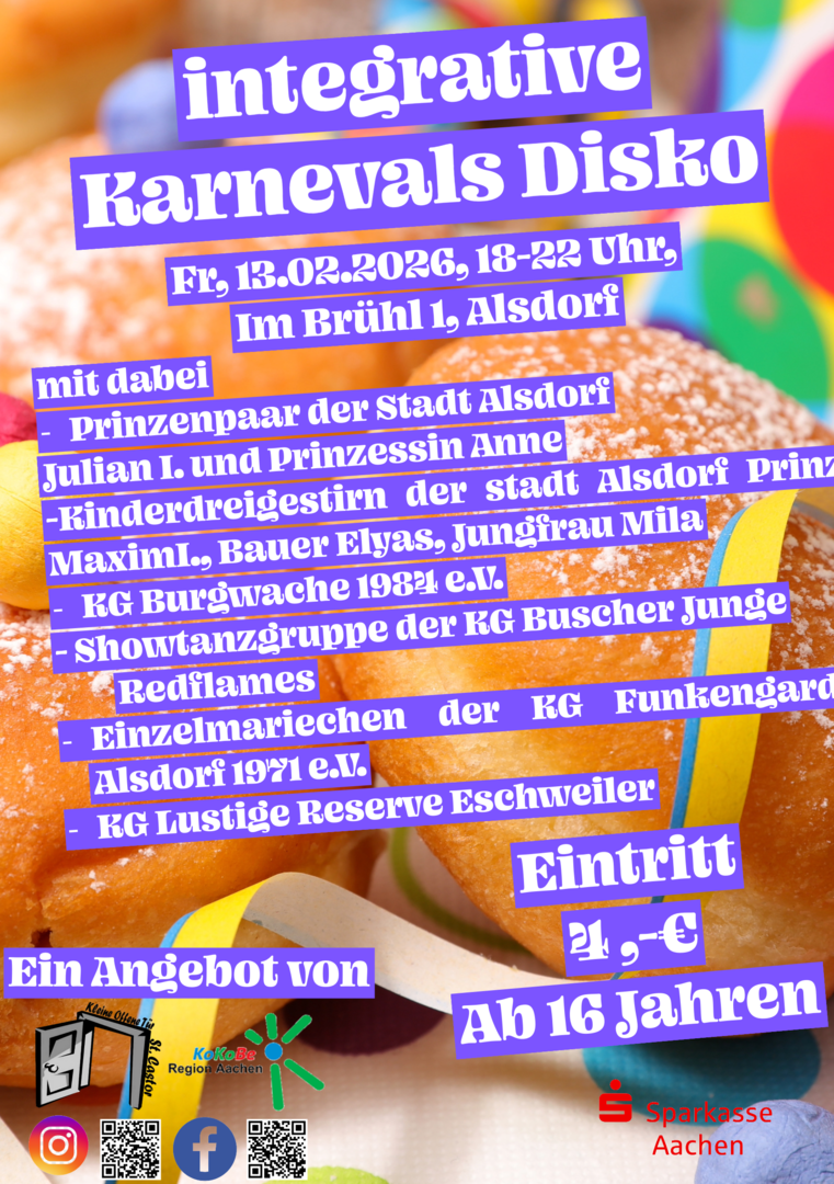 Am Abend folgt die integrative Karnevals-Disko von 18:00 bis 22:00 Uhr .