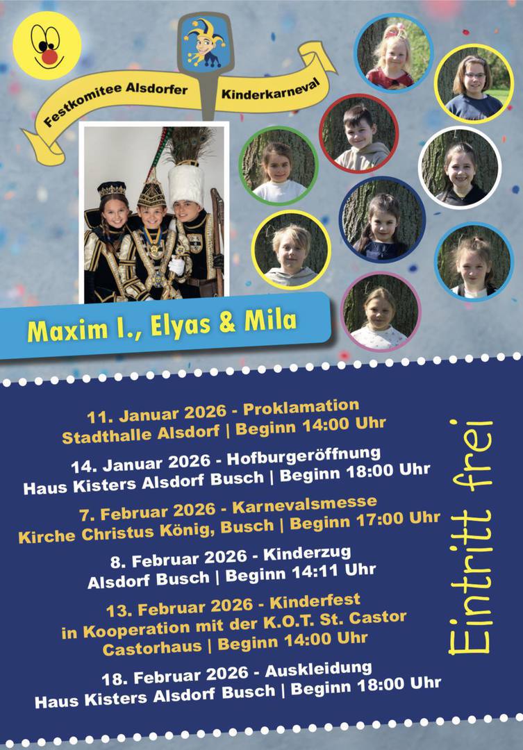 Mit dabei ist das Kinder-Dreigestirn der Stadt Alsdorf Maxim I., Elyas und Mila. Spiel, Spaß und eine jecke Atmosphäre sind garantiert.